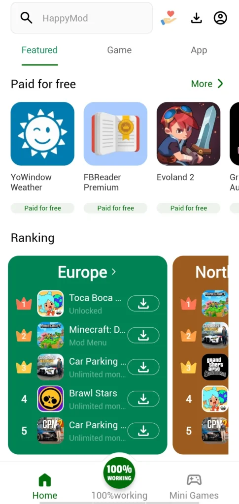 HappyMod is a third-party app store that offers a wide collection of apps and games. It provides free access to paid apps and premium features without any cost, all in one place. With a user-friendly interface, fast downloads, organized categories, no region restriction, and regular updates, this application is one of the best third-party app stores. It is compatible with all devices, including Android phones, iOS Devices, PC, Laptop, and other smart devices.
